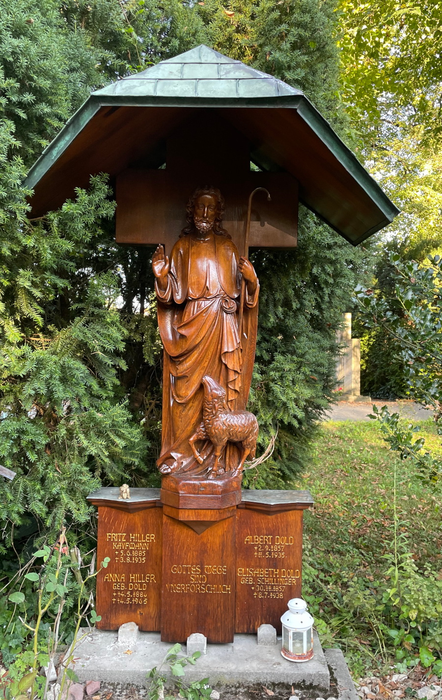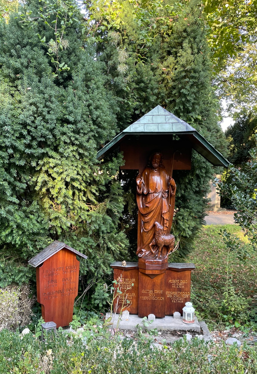 Lebensgroße Skulpturen mit Kreuz und Altar